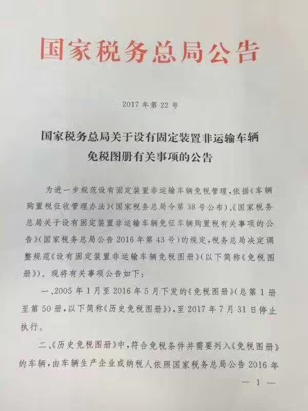 國家稅務(wù)總局關(guān)于設(shè)有固定裝置非運輸車輛免稅圖冊有關(guān)事宜的公告