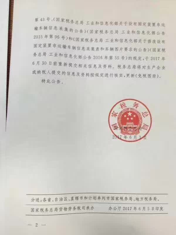 關(guān)于之前一直眾說紛紜的,環(huán)衛(wèi)車將2017年7月1日專用車取消免稅說法,現(xiàn)在國家稅務(wù)總局的正式文件已經(jīng)下發(fā), 已證實, 并不是取消專用車免稅政策, 只是從7月1日起更換免稅圖冊, 新的免稅圖冊沒有下來之前不能辦理免稅 ,所以請需要購新車的客戶提前訂車, 避免造車麻煩 ,環(huán)衛(wèi)車購置稅免征情況說明1、《歷史免稅圖冊》(2005年1月-2016年5月下發(fā)的《免稅圖冊》)將于2017年7月31日停止執(zhí)行。2、《歷史免稅圖冊》中的免征車型由車輛生產(chǎn)企業(yè)于2017年6月30日前重新提交相關(guān)信息與資料進(jìn)行審核,更新《免稅圖冊》。原文如下: