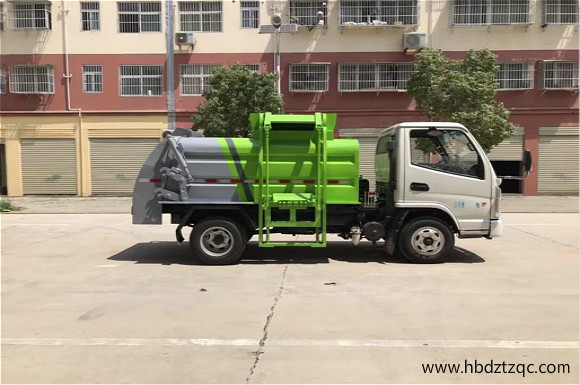 裝載餐廚垃圾: 裝載餐廚垃圾時,將裝有餐廚垃圾的垃圾桶(120L, 240L標(biāo)準(zhǔn)垃圾桶)安裝在提升架上,操作電控箱內(nèi)推板回控制開關(guān),先將廂內(nèi)的推板退回初始位置,打開入料口上蓋(推板沒有回位、上蓋沒有打開時提升裝置不能工作)操縱控制箱內(nèi)的裝載手柄,隨后操縱提升手柄,提升架帯著垃圾桶開始上升,上升過程中,垃圾桶先被鎖緊在翻轉(zhuǎn)架上,從而保證垃圾桶翻轉(zhuǎn)自如而不會脫鉤,垃圾桶提升到廂體上的入料口時,翻轉(zhuǎn)架開始翻轉(zhuǎn)使垃圾桶傾斜,將餐廚垃圾全部倒入垃圾廂內(nèi),實現(xiàn)餐廚垃圾的自裝功能。垃圾倒入廂內(nèi)后,操縱手柄使垃圾桶放下來。