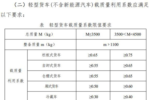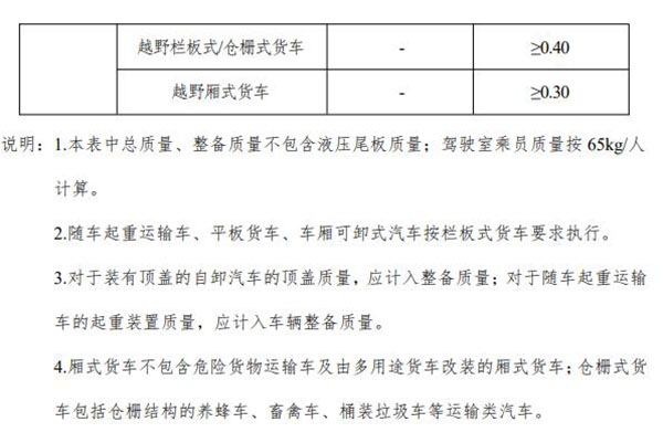 對載質量系數(shù)的要求中包含很多專用車型,其中隨車起重運輸車、平板貨車、車廂可卸式汽車按欄板式貨車要求執(zhí)行;對于裝有頂蓋的自卸汽車的頂蓋質量,應計入整備質量,對于隨車起重運輸車的起重裝置質量,應計入車輛整備質量;廂式貨車不包含貨物運輸車及由多用途貨車改裝的廂式貨車,倉柵式貨車包括倉柵結構的養(yǎng)蜂車、畜禽車、桶裝垃圾車等運輸類汽車。