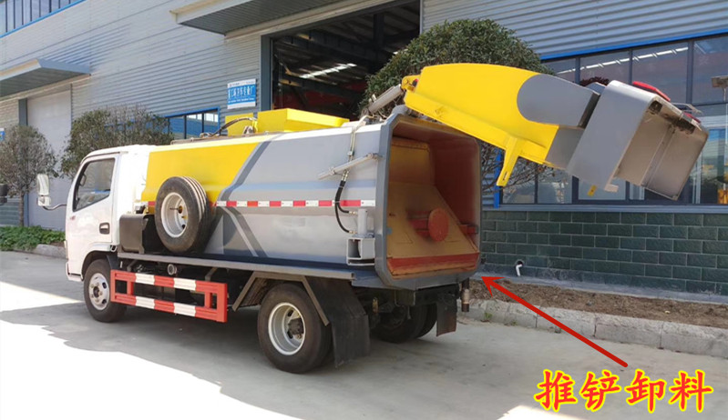 2、推鏟卸料,罐體內(nèi)部液壓推板推出垃圾。
