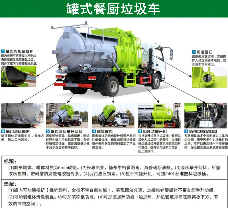 圓罐式餐廚垃圾車:圓形罐體,罐體液壓舉升卸料,后蓋液壓打開和鎖緊(帶耐磨防腐蝕硅膠密封條密封-后門關(guān)閉后滴水不漏),后門液壓鎖緊裝置,掛桶式提升機(jī),可配合120升、240升標(biāo)準(zhǔn)垃圾桶使用。